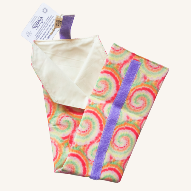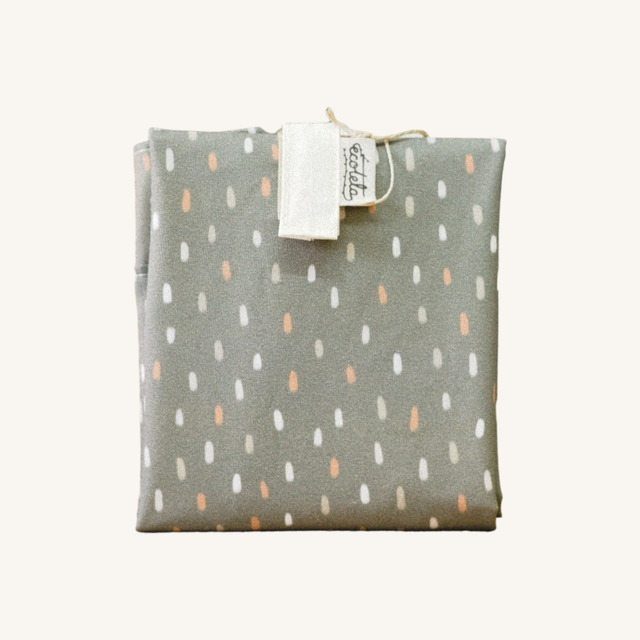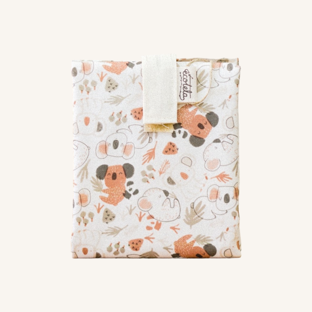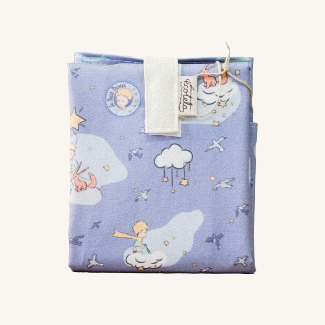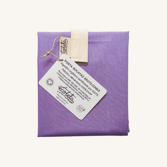 Envoltorio de bocadillos y otros alimentos, de algodón orgánico en el exterior y plástico alimentario reutilizable en el interior. Para sustituir el papel film y de aluminio por una opción reutilizable y saludable.