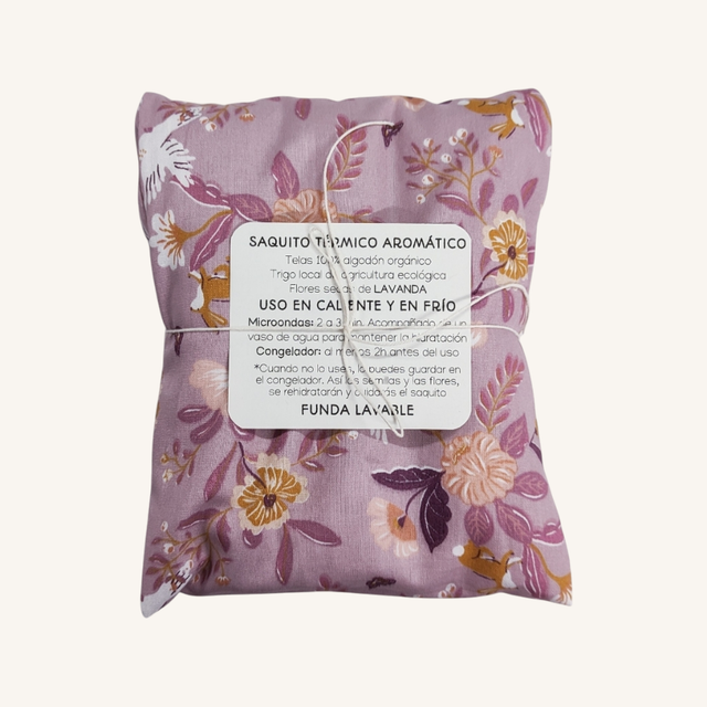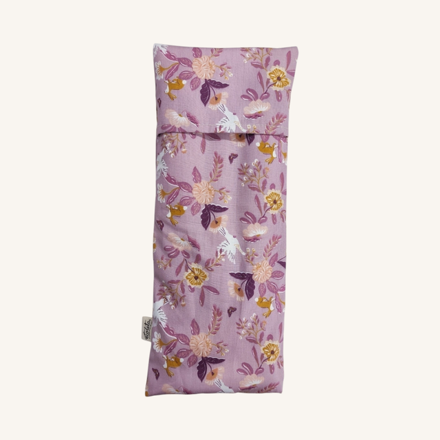 Relleno de trigo de agricultura ecológica y flores aromáticas secas. Con funda estampada lavable 100% algodón orgánico. Medida: 37x14cm